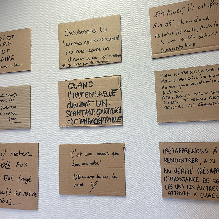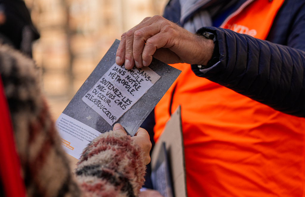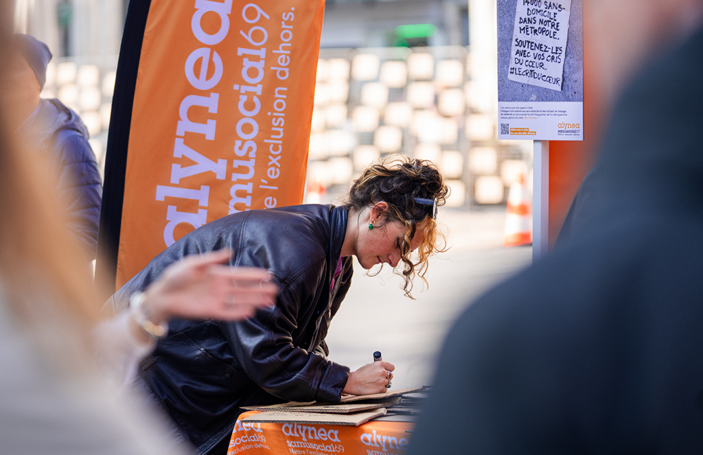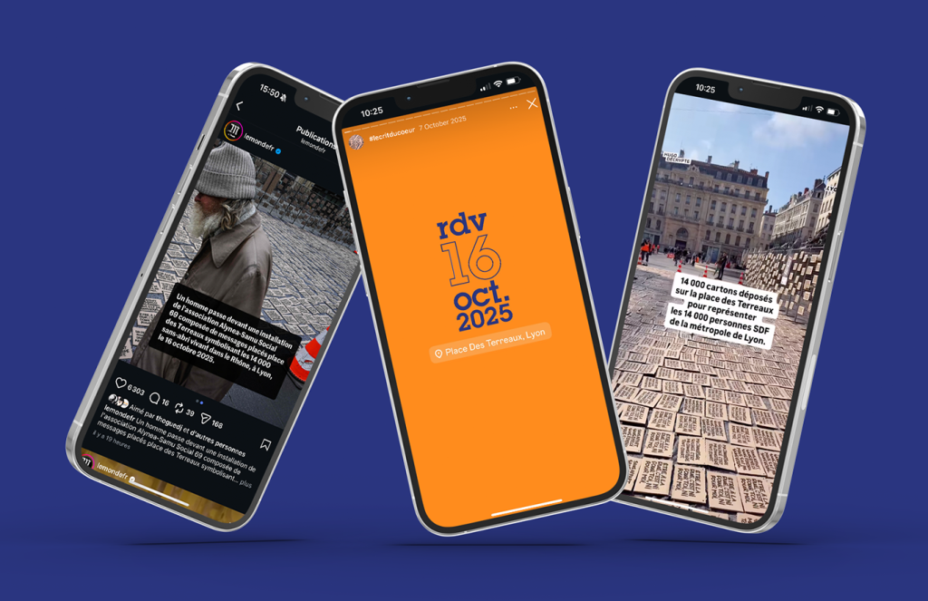 14 000 cartons, porteurs de messages, disposés sur la place des Terreaux, un barnum dans lequel on invitait les passants à laisser un message de soutien aux sans-domicile avec l’opération #LécritDuCœur. La campagne a été relayée en amont et le jour J sur les réseaux de l’association, mais également en RP avec de nombreuses retombées, et a attiré de nombreux élus, dont le maire de Lyon.